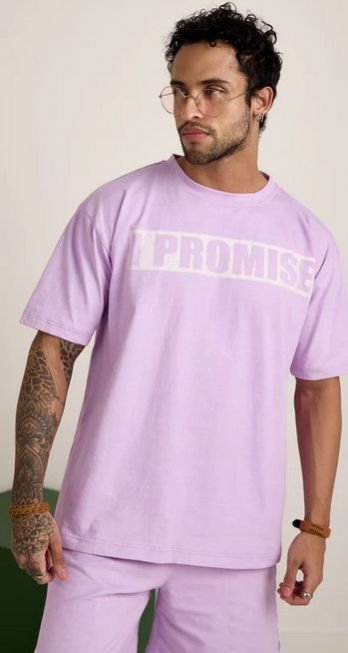 A cool ice blue t-shirt for men with a print on the center front and back. It has a oversize fit, so it 's comfortable and easy to wear. The t-shirt features a classic round neck and half sleeves, making it perfect for casual, Basic wear. A plain mauve shorts designed for men. These shorts are not only stylish but also practical with pockets on both sides. And to add a touch of charm, there 's a cute little silicone mascot placed near the right pocket. It 's the perfect combination of functionality and fun for those sunny days.