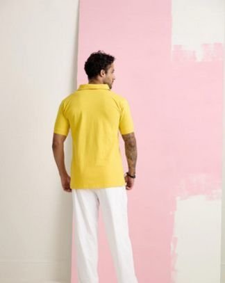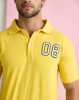 This polo t-shirt comes in a vibrant yellow color that 's sure to catch some attention. It 's a classic style with a modern twist.